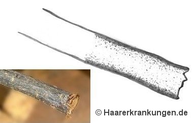 Abgebrochene Haare sind auch für den Laien einfach zu erkennen: Der Haarschaft endet plötzlich mit einer glatten, z.T. etwas gezackten Fläche. Es handelt sich bei diesen Haaren zumeist um Anagenhaare, die aufgrund einer erworbenen oder angeborenen verminderten Reißfestigkeit beim Auszupfen einfach abbrechen. Abgebrochene Haare machen im Normalfall bis zu 10% der Haare eines Trichogrammes aus und sehen aus wie ein abgesägter bzw. abgebrochener Zweig. |