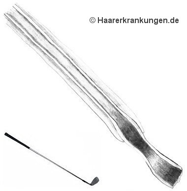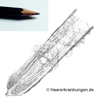 Dystrophische Haare kommen im normalen Trichogramm nur zu einem Anteil von bis zu 4% vor und sind keiner Phase des Haarzyklus zuzuordnen. Man erkennt sie am dünnen Haarschaft und dem spitz zulaufenden Ende. Dystrophische Haare treten zumeist dann in höheren Prozentzahlen auf, wenn die Haare einer akuten, mehr oder weniger stark schädigenden Einwirkung ausgesetzt waren. Das bekannteste Beispiel hierfür ist der Haarverlust nach Durchführung einer Chemotherapie. Dystrophische Haare sehen etwas aus wie ein Bleistift. |