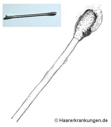 Nach der Anagenphase und der kurzen Katagenphase kommen die Haare in die Ruhephase und formen sich zu Telogenhaaren um. Sie werden dabei insgesamt kürzer und entwickeln im Kontrast zum dünner werdenden Haarschaft ein gut sichtbares verdicktes Ende. Sie werden deshalb auch als "Keulenhaare" bezeichnet. Telogenhaare machen im Normalfall bis zu 20% der Haare eines Trichogrammes aus. Telogenhaare sehen aus wie ein Wattestäbchen. |